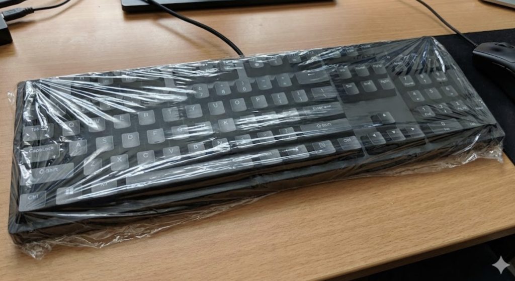台所にあるサランラップを巻きつけるのもおすすめです。素材自体が薄くてとても柔らかいため、キーの隙間にもある程度フィットしてタイピングを邪魔しないためです。