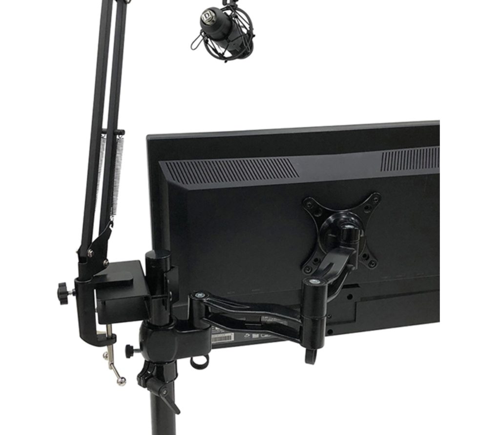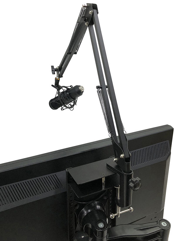 支柱の好きな高さに自由に取り付けられるため、モニターの上にマイクを配置するようなセッティングも簡単に作れます。支柱があるタイプのモニターアームを使っている方に一番おすすめの解決策です。