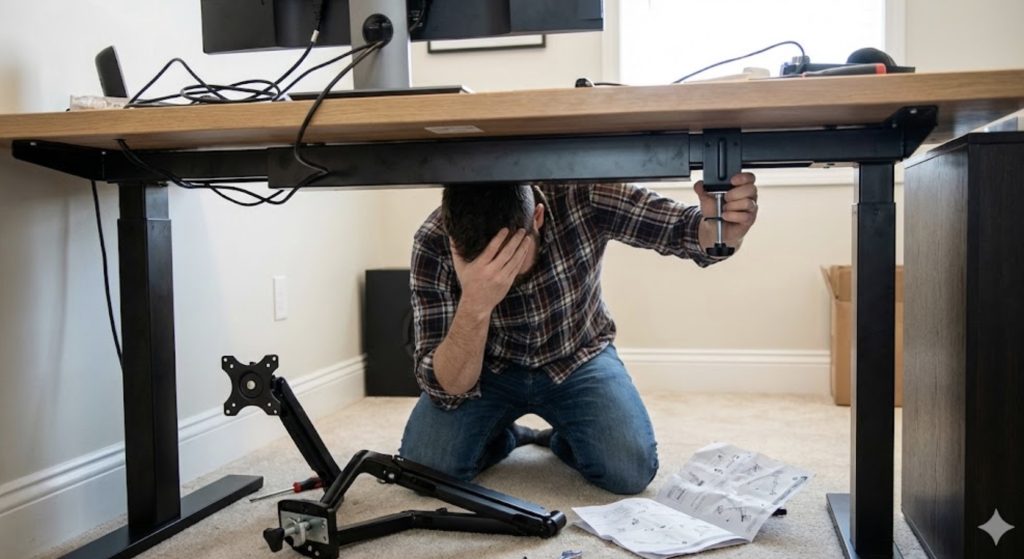 モニターアームを付けたいのにデスクの奥側にクランプを挟むスペースがなくて困っていませんか?手前に付けるしかないかもと悩む方は多いです。