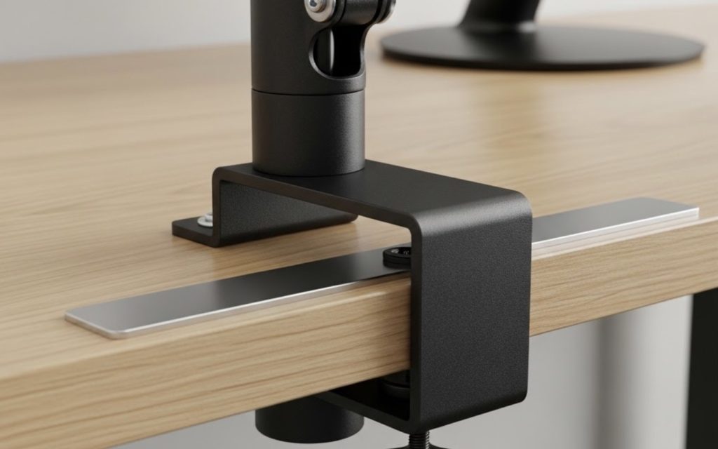 デスクの奥に金属フレームなどの段差がありクランプが挟めない場合は補強プレートや当て木で平らな面を作れます。木の板やモニターアーム用の補強プレートを挟むことでクランプの設置面を確保できます。