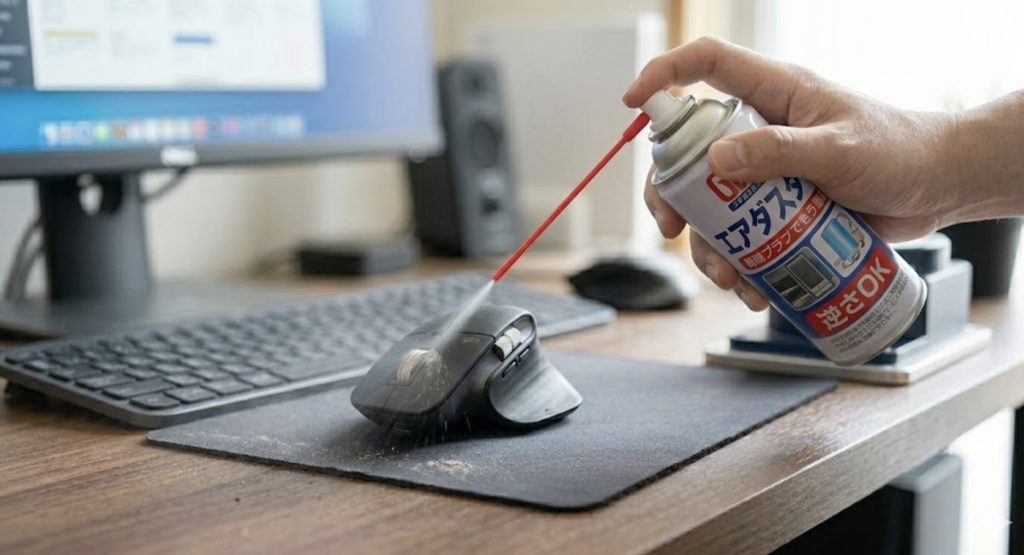 ゴミの詰まりが原因かもしれない場合、エアダスターを使ってマウスの隙間から勢いよく空気を吹き込んでみてください。スイッチ付近のホコリやゴミが吹き飛ぶことで、以前のような軽い正常なクリック感をすぐに取り戻せます。